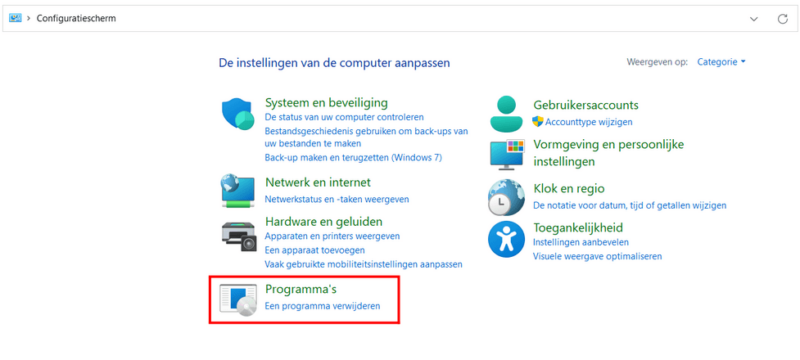 - Klik in het Configuratiescherm op “Programma’s” en vervolgens op “Programma’s en onderdelen”.