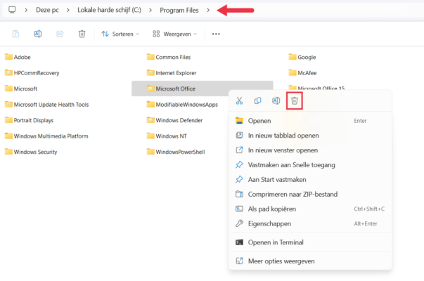 - Navigeer naar de installatie-map (meestal “C:\Program Files\Microsoft Office”) en verwijder alle bestanden en mappen die met Office zijn verbonden.