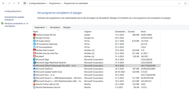 - Blader door de lijst met geïnstalleerde programma’s en zoek naar “Microsoft Office”.