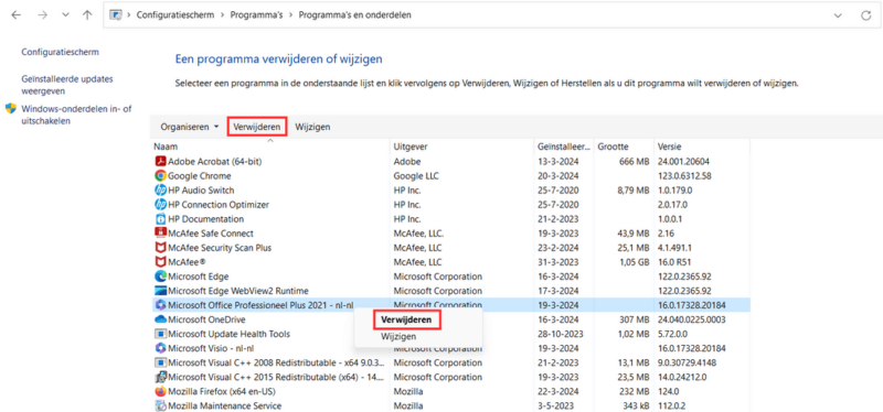 - Klik met de rechtermuisknop op “Microsoft Office” en selecteer “Verwijderen”. Volg de aanwijzingen op het scherm om de verwijdering te voltooien.