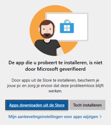 Dit venster wordt getoond om de gebruiker ertoe te bewegen (of zelfs te verplichten) alleen door Microsoft geverifieerde apps via de Store te installeren. U kan dit simpelweg uitschakelen door de aanbevelingsinstellingen aan te passen. Onze collega’s van schoonepc.nl hebben hier een simpele handleiding en uitleg voor geschreven : Q&A: Niet door Microsoft geverifieerde apps (schoonepc.nl)