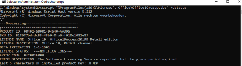 Voor 32 bits Office : cscript “%ProgramFiles(x86)%\Microsoft Office\Office16\ospp.vbs” /dstatus